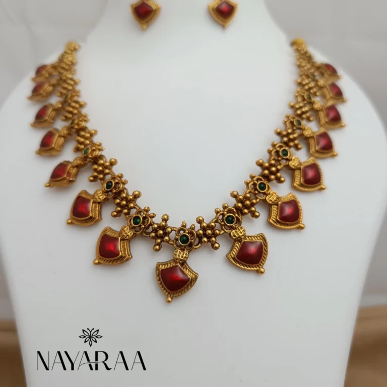 Step into the radiance of a classic era with this magnificent piece of traditional Indian jewellery. Expertly designed, this piece evokes the spirit of South Indian antique necklace collections. Therefore, it is the ultimate statement for those seeking bridal jewelry with a rich heritage aesthetic. Moreover, its detailed craftsmanship makes it an essential addition to any festive or wedding ensemble.