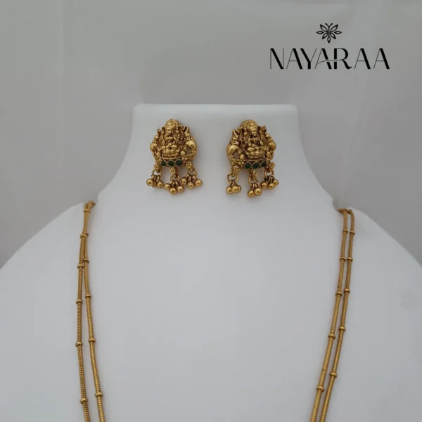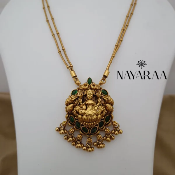 The Chain Dollar CD14G is a beautiful piece inspired by the auspicious tradition of coin necklaces (Kasumala or Kasu Haram). This necklace offers a harmonious blend of rounded, flowing design and the vibrant depth of green stones, embodying prosperity and traditional grace.