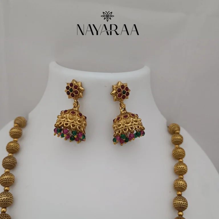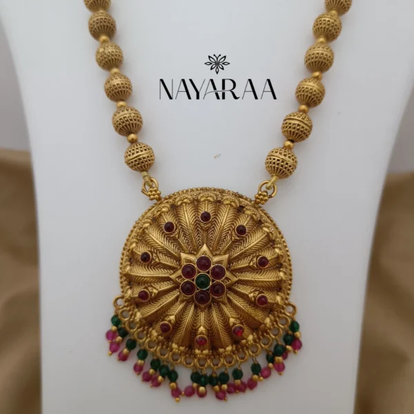 Step into the radiance of a classic era with this magnificent piece of traditional Indian jewellery. Expertly designed, this piece evokes the spirit of South Indian antique necklace collections. Therefore, it is the ultimate statement for those seeking bridal jewelry with a rich heritage aesthetic. Moreover, its detailed craftsmanship makes it an essential addition to any festive or wedding ensemble.
