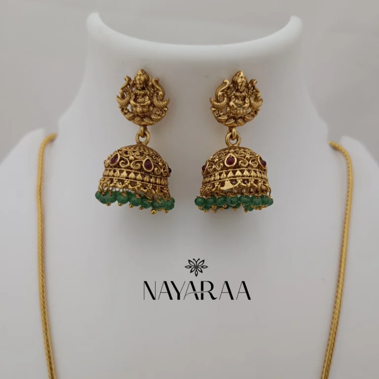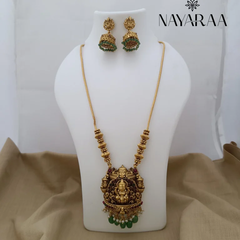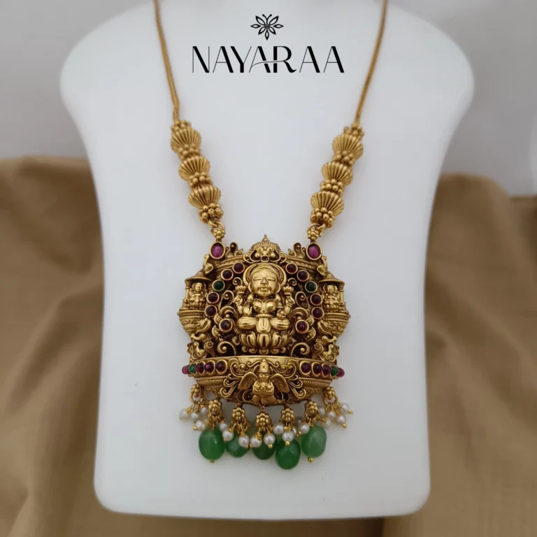 Step into the radiance of a classic era with this magnificent piece of traditional Indian jewellery. Expertly designed, this piece evokes the spirit of South Indian antique necklace collections. Therefore, it is the ultimate statement for those seeking bridal jewelry with a rich heritage aesthetic. Moreover, its detailed craftsmanship makes it an essential addition to any festive or wedding ensemble.