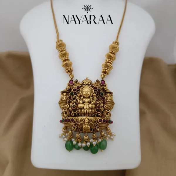 Masterful Metalwork: First, we craft the foundation from high-grade, lustrous brass. We meticulously sculpt the brass to achieve the heavy, intricate look of historical temple designs. Next, a specialized oxidized antique finish provides a coveted, deep patina. This process gives the necklace the appearance of a cherished heirloom.