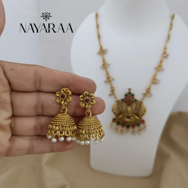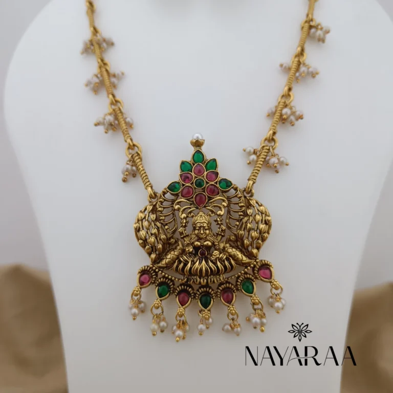 Step into the radiance of a classic era with this magnificent piece of traditional Indian jewellery. Expertly designed, this piece evokes the spirit of South Indian antique necklace collections. Therefore, it is the ultimate statement for those seeking bridal jewelry with a rich heritage aesthetic. Moreover, its detailed craftsmanship makes it an essential addition to any festive or wedding ensemble.