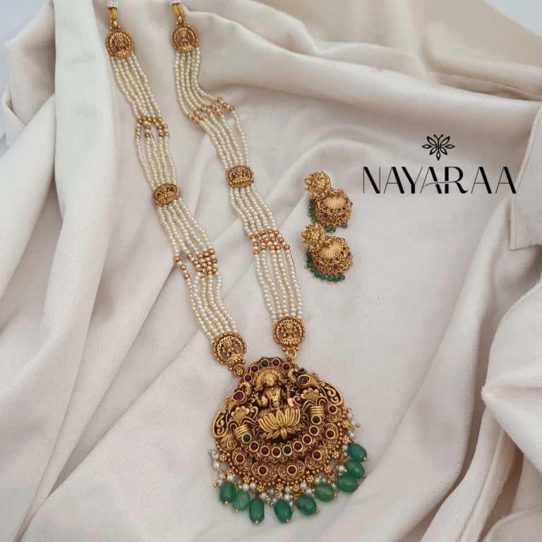 Step into the radiance of a classic era with this magnificent piece of traditional Indian jewellery. Expertly designed, this piece evokes the spirit of South Indian antique necklace collections. Therefore, it is the ultimate statement for those seeking bridal jewelry with a rich heritage aesthetic. Moreover, its detailed craftsmanship makes it an essential addition to any festive or wedding ensemble.